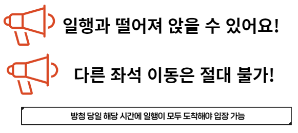 ▶ 좌석 입장후, 제일 중요한 녹취, 사진 및 동영상 촬영은 절대 불가하니 이것은 꼭 지켜주셔야합니다. 이를 어기면 경고, 퇴장 당하는 제재를 받을 수 있으니 꼭 지킵시다.