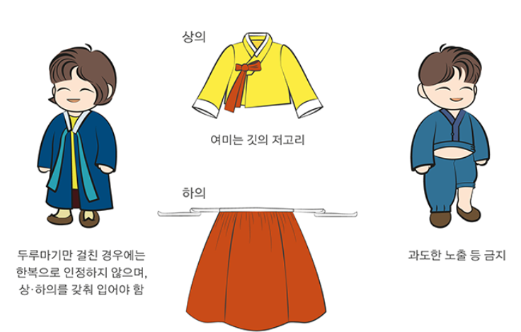 한복은 정통한복, 행 활한 복 모두 포함이 되며, 상의와 하의를 기본으로 합니다. 단, 두루마기만 걸친 경우에는 인정하지 않으며, 상 하의를 갖춰 입어야 합니다.