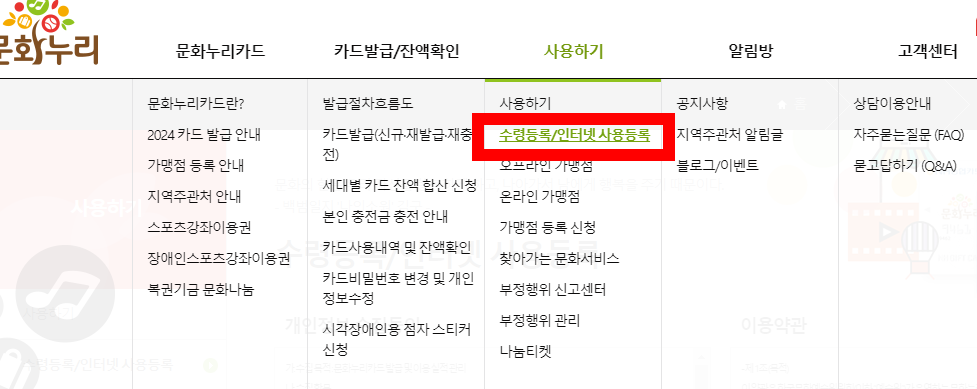 먼저 PC에서 등록하는 방법은 문화누리카드 홈페이지에 접속하셔서 수령등록/인터넷 사용등록을 선택해주세요.