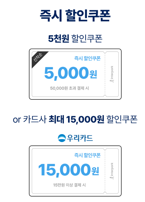 인터파크 여행에서는 5천원 할인쿠폰뿐아니라 우리카드 사용시 최대 15,000원까지 할인이 되는데요. 사이트 확인하셔서 똑똑한 여행 되시길 바랍니다.
