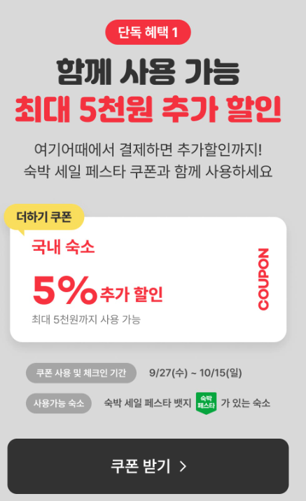 여기어때에에서 숙박을 결제하면 추가 5% 할인 쿠폰을 덤으로 준다고 합니다. 숙박 사이트들을 비교하여 더 저렴한 숙소를 예약해보시는게 좋을 것 같습니다.