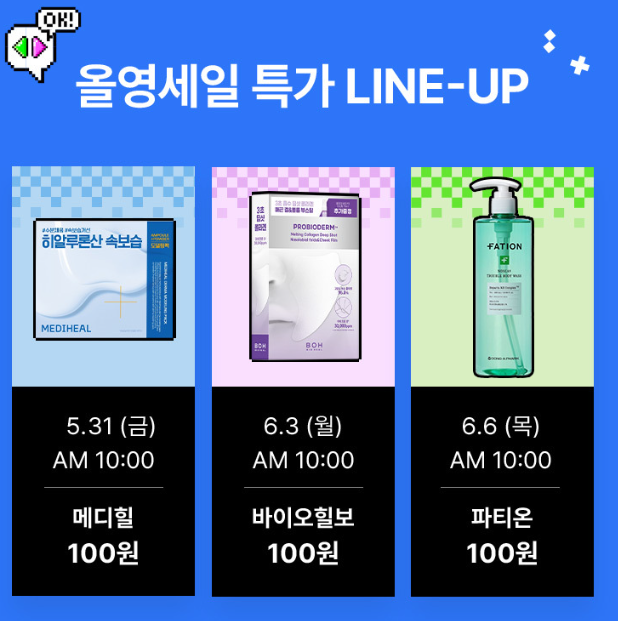 올리브영 세일에서 절대 놓쳐서는 안될 초특가 라인업 소식을 전해드릴게요. 믿을 수 없는 가격, 단 돈 100원에 파티온을? 메디힐을? 바이오힐보를?