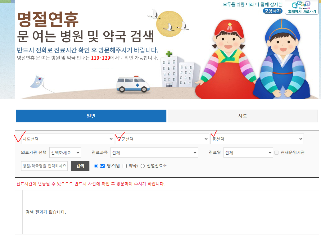 진료시간이 변동될 가능성이 크므로 반드시 사전에 병원 및 약국 전화로 확인한 후 찾아가셔야 합니다.