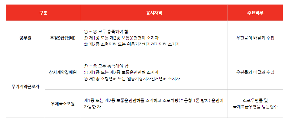 공무원, 무기계약근로자 모두 운전면허증이 필수사항이며 특히 우체국소포원은 수동형 1톤 탑차 운전이 가능하셔야 합니다.