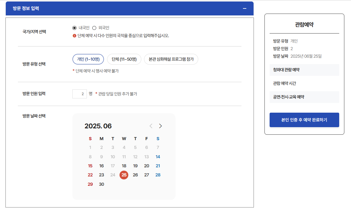 개인(1~10명)과 단체(11~50명) 모두 예약이 가능하며, 1인 1회 예약만 허용됩니다. 예약 후에는 예약 취소 또는 관람 완료 전까지 추가 신청이 불가하니 일정을 정확히 확인해 주세요.