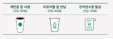 👉 적립 기준 : 개인용 컵사용 건당 300원, 리유저블 컵 반납 건당 300원, 전자영수증 발급 건당 100원
